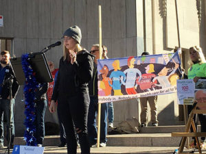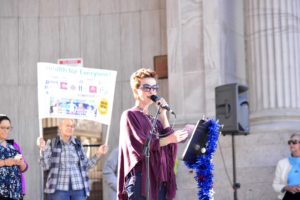 Photo by Geoff Dolman: Tina Lehman of the United Nations Association of Denver calls for everyone to have health care Dec. 12 in Denver.