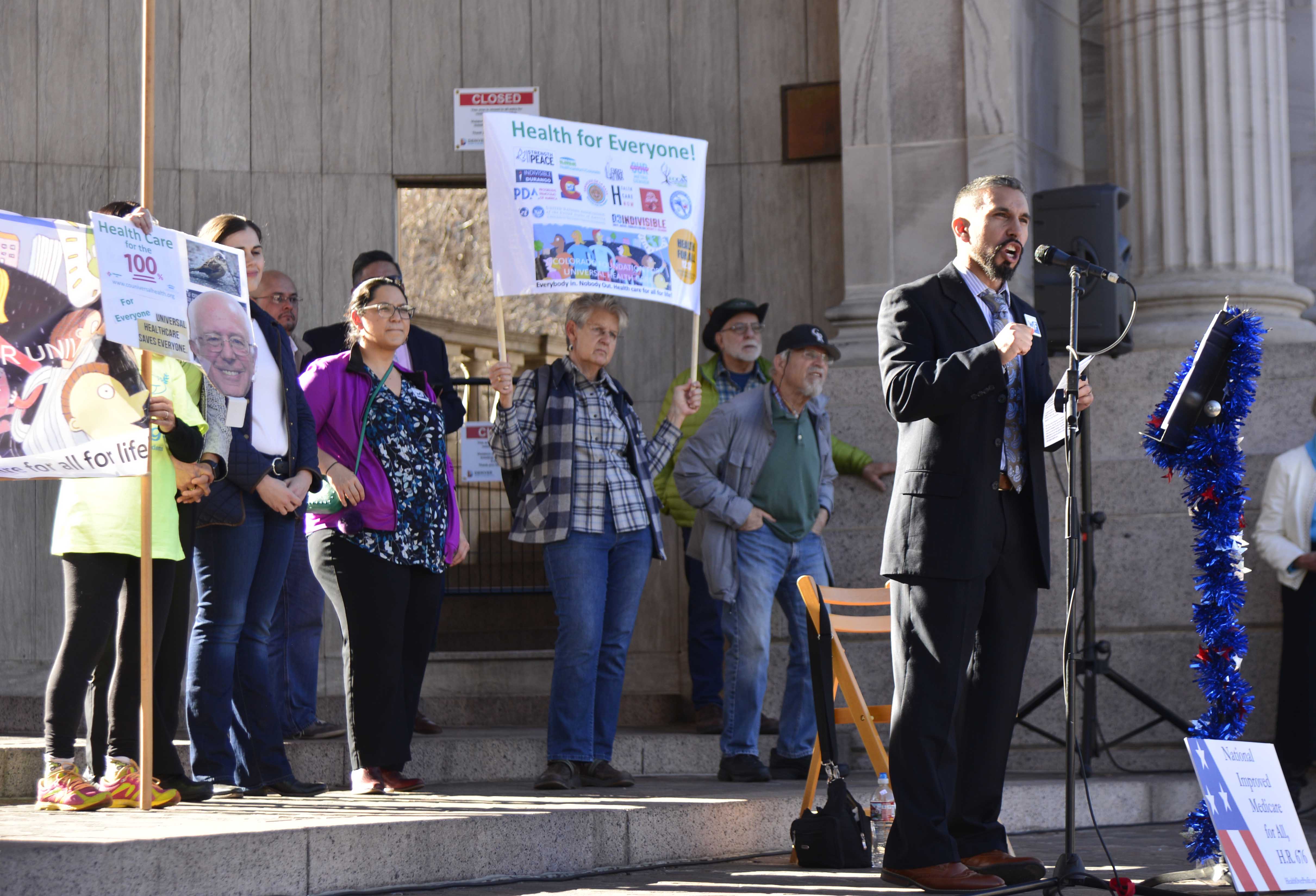 Photo by Geoff Dolman: Carlos Valverde of Colorado Working Families calls for universal health care now on Tuesday in Denver.