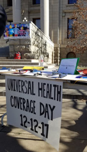 Almost 500 Coloradans attended one of five rallies Tuesday for #HealthforAll hosted by the Colorado Foundation for Universal Health Care and more than 20 partners at high noon on 12-12 in Fort Collins (Read the Ft. Collins story here), Boulder, Denver, Colorado Springs and Durango. Ralliers cheered, waved signs, chanted, and sang songs demanding universal health care in honor of global Universal Health Coverage Day, a day of action marking the five-year anniversary of the United Nation’s historic and unanimous 2012 endorsement of universal health care.