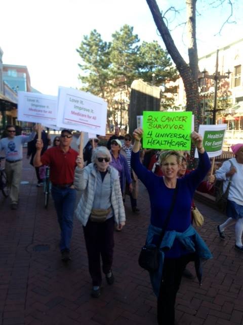 Even so, about 25 attendees made a strong showing for the need for #HealthforAll. They met at the Boulder Bandshell and then carried signs and marched and chanted through the busy Boulder downtown area at lunchtime, winding up in front of the old courthouse at 13th and Pearl.