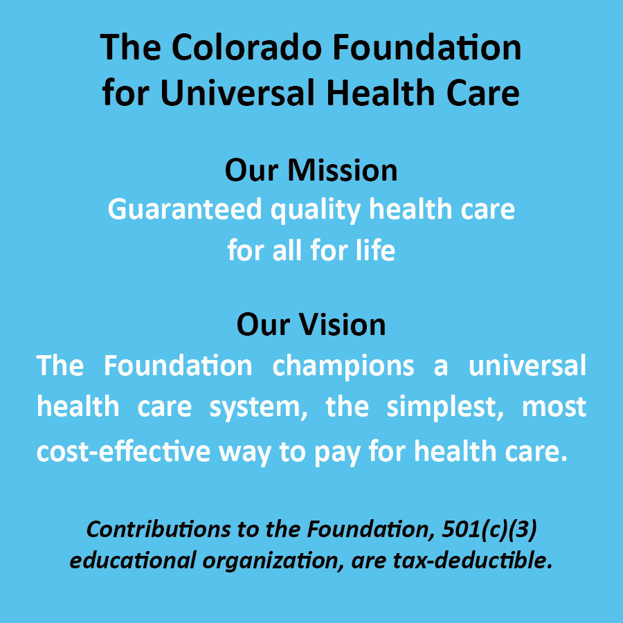 The Colorado Foundation for Universal Health Care promotes a not-for-profit health care financing system at the state and/or national level that pays for comprehensive, high quality, affordable health care services for everyone.