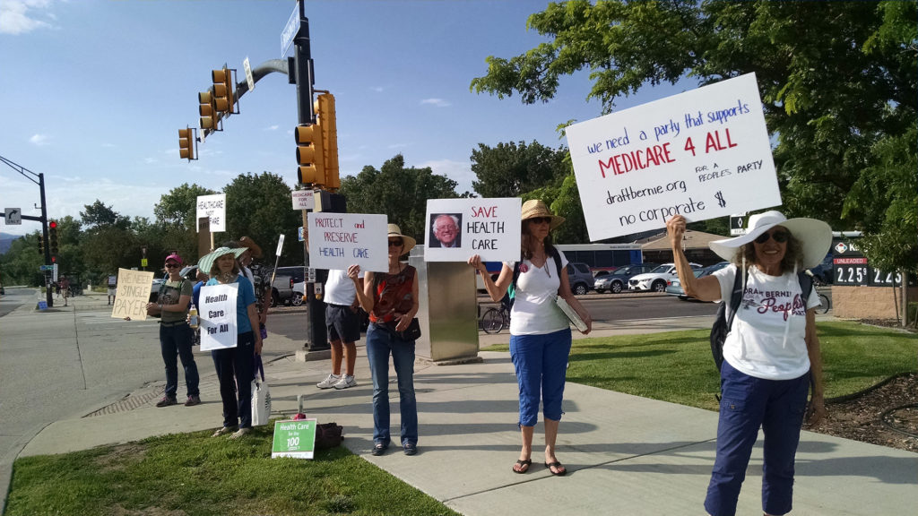 About 20 marchers held signs July 24 in Boulder that read “Human need, not corporate greed,” “Medicare for all,” and “Health care not warfare” as a steady stream of drivers honked in support.